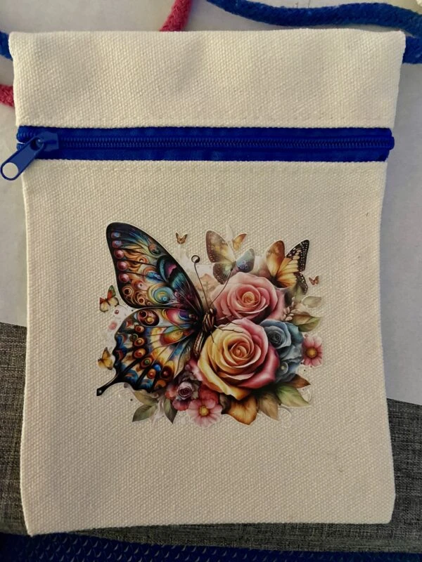 Butterfly crossbody bag. Store made. Approx. paperback size. Single small zippered section.